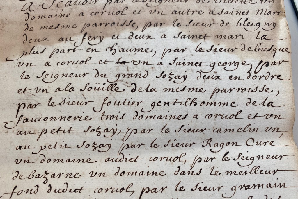 A particular highlight was a lengthy document detailing a court case brought by the inhabitants of Corvol. It appears that in the early 1700s, one of the owners of the Château de la Porte, François Foutier, Gentilhomme de la fauconnerie de France, had a somewhat exaggerated understanding of his prerogatives as a ‘Seigneur’, and usurped lands and shot at the pigeons of his neighbours (an extremely valuable asset at the time).