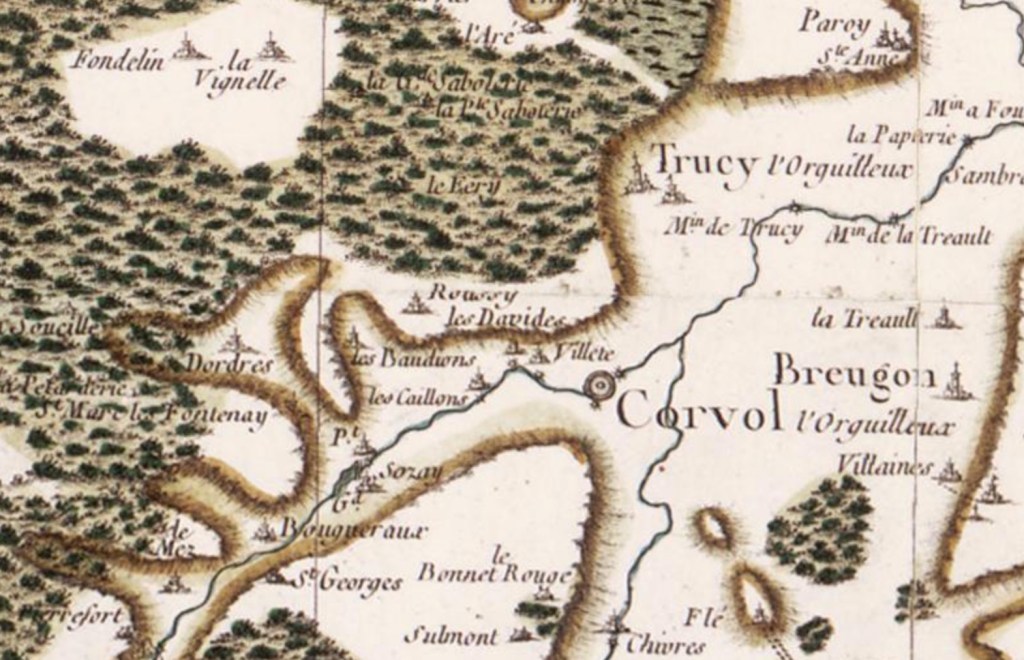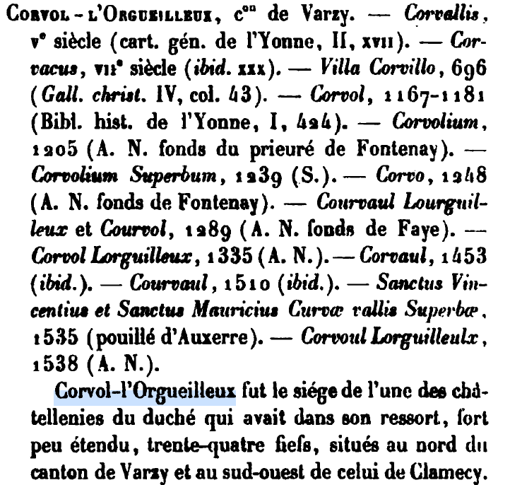 L’historien Morellet écrit d’ailleurs, en 1838, que les fortifications de Corvol (abattues par la garde nationale en 1791) justifiaient la dénomination de l’Orgueilleux appliquée à ce bourg. (Source : Dr Létinois. Bulletin de la Société scientifique artistique de Clamecy. 1948. Gallica.bnf.fr / BnF).