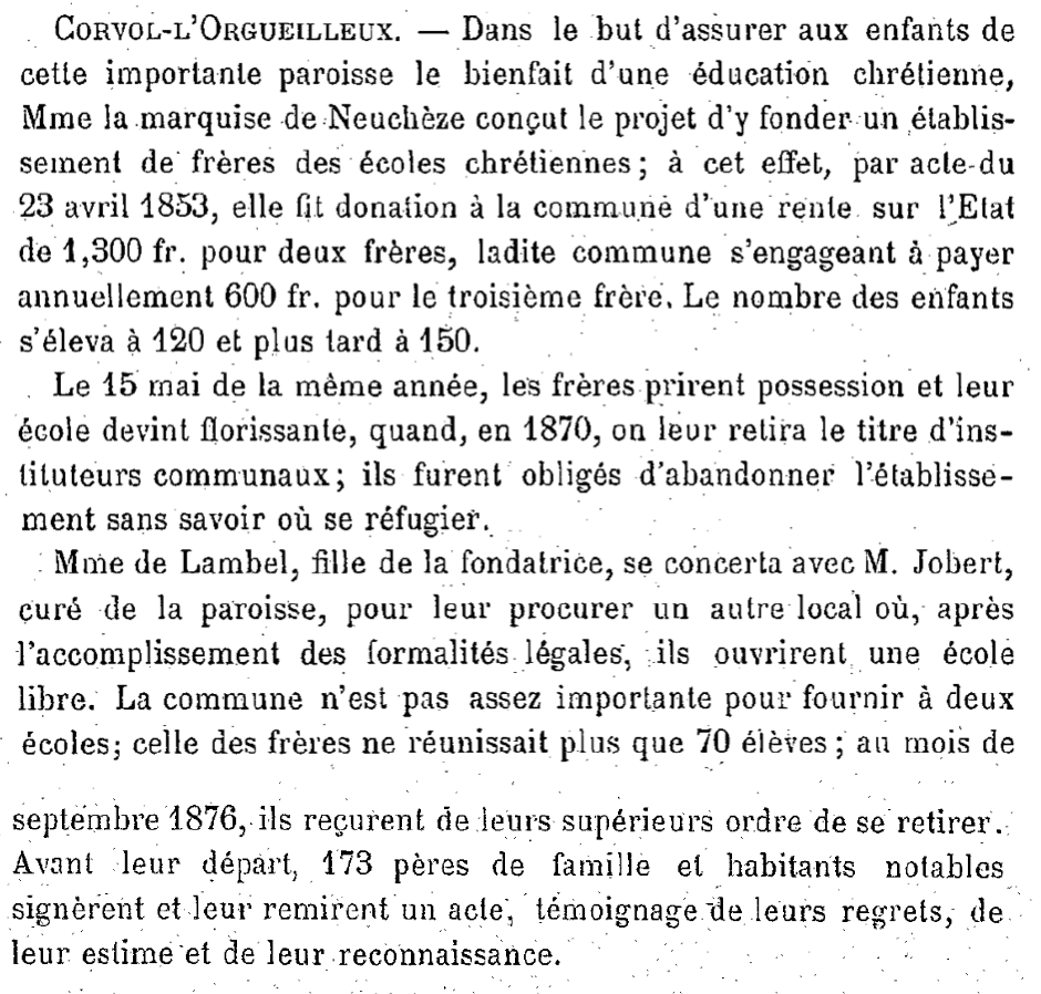 The Château de la Porte was used by a religious order as a school from the middle of the XIX century. In 1853, according to Létinois, the Marquess de Neuchèze committed to an annual donation of 1,300 francs to pay for two brothers of the ‘écoles chrétiennes’, with the commune responsible for the costs of a third teacher, and the Château de la Porte was donated by the Marquess to accommodate the school, where it continued to function until it was closed in 1870. Following a request by the family, property was returned by the Conseil municipal (municipal council) in 1873 to the ownership of Viscount de Lambel.