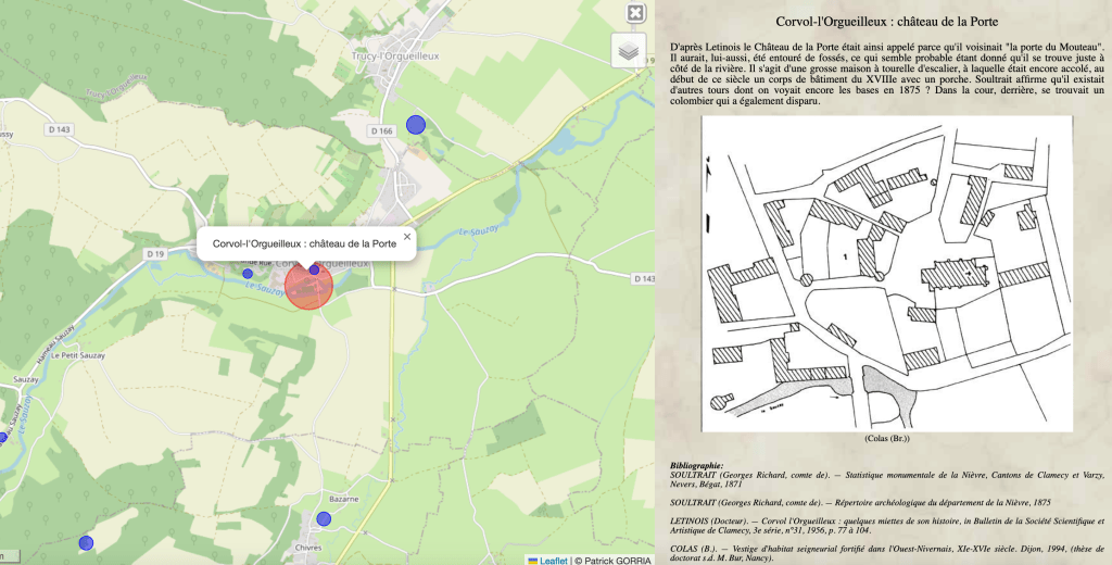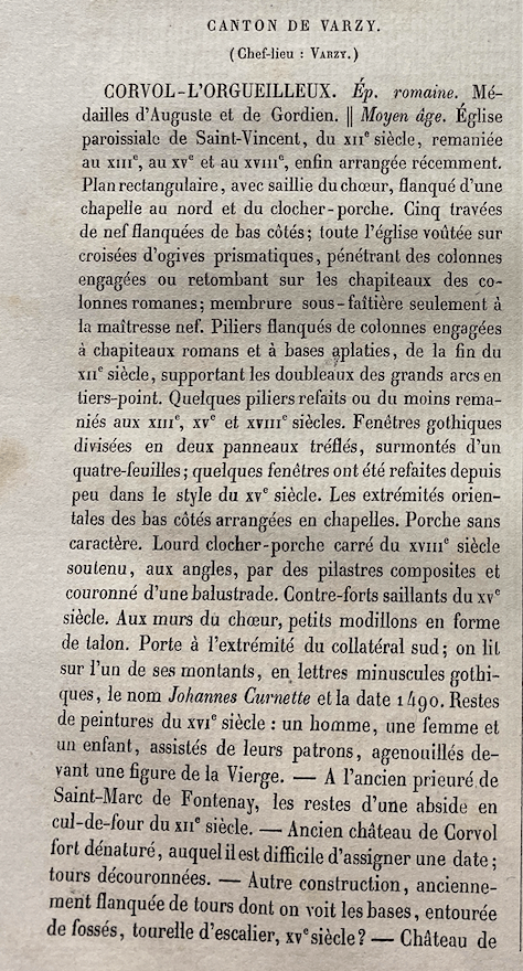 In his 1843 book La Loire historique, pittoresque et biographique, Touchard-Lafosse describes Corvol and the remnants of the Château which were still visible at that time. ‘There are imposing remnants of the château of Corvol: its plan was quadrangular; its mutilated towers recall the military architecture of the XIII century. The moat, now dried and almost filled, were fed by the Sauzay stream, which, higher upstream, is the principle motor of the Villette papermill.’