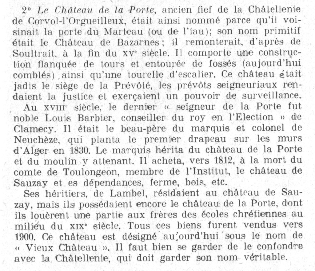 Around 1812, on the death of Count de Toulongeon, a member of the French Academy, the Marquis also purchased the nearby Château de Sauzay and its dependencies, farms and forests. His successors, the family of Viscount Label de Lambel, resided at the Château de Sauzay and also owned the Château de la Porte, together with the surrounding buildings, land and mill.